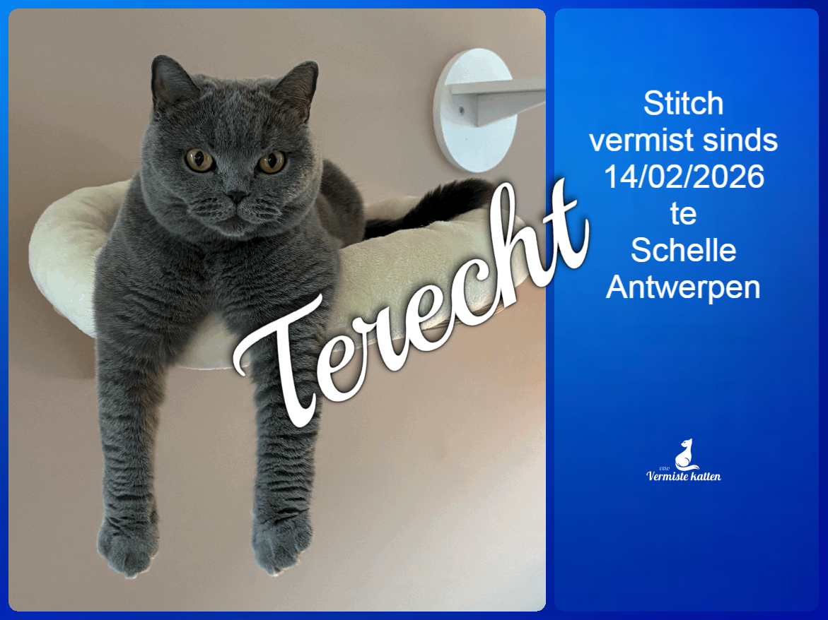 UPDATE 05/03/2026 : Onze kat stitch is terug thuis. Ze zat 18 dagen op...