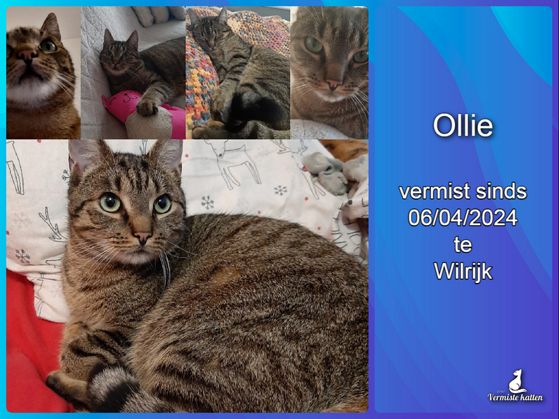 Aanvullende kenmerken: Sinds 6 April is Ollie niet meer naar huis gekomen. Hij is gecastreerd gechipt. Hij heeft een wit vlekje onder de kin.