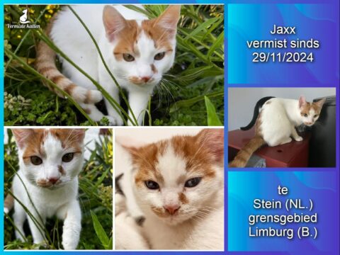 Aanvullende kenmerken: Jaxx is een zeer lieve en sociale kater, hij is wit met oranje vlekken vooral in het gezicht en de staart met oranje ringetjes, hij draagt geen halsband.