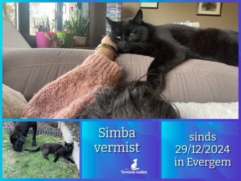 Aanvullende kenmerken: Zwarte kat met drie poten waarvan de linker achterpoot vermist is. Simba is redelijk groot en is geen raskat. Hij heeft geen chip omdat hij een auto immuunziekte heeft waardoor hij reageert op de chip.