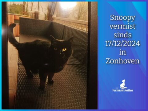 Aanvullende kenmerken: Snoopy is een gezonde zwarte kater met een mooie glanzende vacht. Hij draagt geen halsband omdat hij altijd zijn bandje weet uit te krijgen. Hij is een beetje schuw en laat zich niet snel vangen. Hij houdt van de natuur.