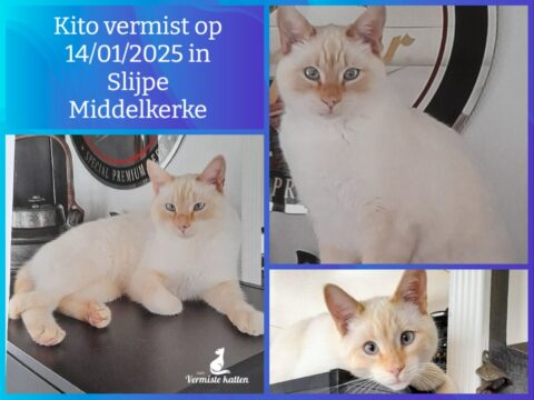 Aanvullende kenmerken: Onze kat Kito is wit met ros op het einde van de staart en aan de pootjes. Ook ros in de snoet. Blauwe ogen, soms grijs. Heeft ook enkele zwarte vlekjes op de neus. Is heel angstig naar onbekenden. Kito is verdwenen van de camping Cosmos II in de Loviestraat