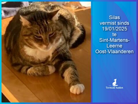 Aanvullende kenmerken: Tijger , met witte borst en witte pootjes., Eerder dikke poes. Onze poes Silas is vorige zaterdag in de auto van buren gekropen. Op maandag werd de motorkap geopend en sprong onze kat in paniek uit. Die mensen wonen Leerne maar wij in Latem, dus het grote probleem is dat de Leie ertussen zit. We zijn al 4 vonden overal gaan zoeken, flyers gepost. Mocht u Silas gespot hebben , gelieve ons te contacteren