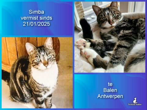 Aanvullende kenmerken: Het gaat om een zwart/grijze gepanterde tijger met witte kraag en witte pootjes. Heel nieuwsgierig, sociaal en affectief. Wie heeft hem gezien? Hij is heel speciaal, ondersteunt mensen mee in therapie. De kinderen missen Simba enorm.
