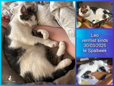 Aanvullende kenmerken: Leo zwart/wit/grijze kater. Niet heel groot. Luistert naar z’n naam en is super lief