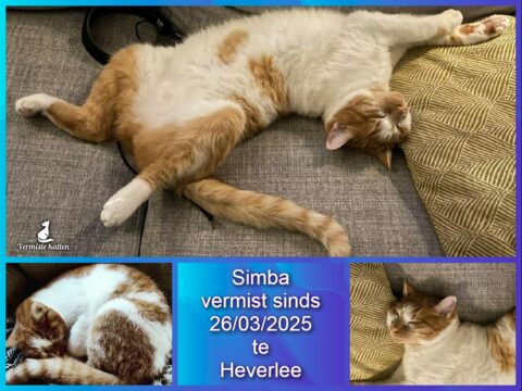 Aanvullende kenmerken: Simba’s vacht is ros-wit en zeer zacht. Hij is lief en laat zich makkelijk aaien. Misschien is hij ergens opgesloten geraakt, zoals in een kelder, garage of tuinhuis. Het is immers niet van zijn gewoonte om zo lang weg te blijven. Onze kinderen missen hem heel erg. Alvast heel erg bedankt voor alle hulp bij het zoeken!