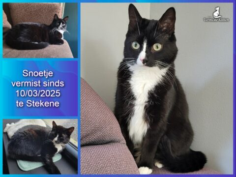 Aanvullende kenmerken: Snoetje is een angstig binnenhuiskatje. Ze is voornamelijk zwart met een witte buik, witte sokjes en een witte streep op haar neusje.