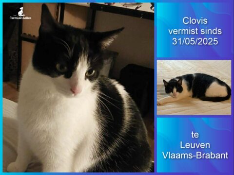 Aanvullende kenmerken: Clovis is wit en zwart. Hij heeft een gemiddelde grootte. Ronde buik. En wat kortere pootjes. Zijn huisje is in de Ernest Solvaystraat, dichtbij ’t station in Leuven. We maken ons zorgen nu hij al meer dan een week van huis is. En zijn broertje Ernest loopt er triest bij.