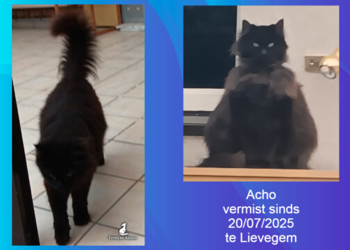 Aanvullende kenmerken: Acho is een lieve zwarte, langharige kater. Op het moment van zijn verdwijning droeg hij een grijze halsband en had hij minder vacht aan zijn achterpootjes en zijn zijkanten door een trimbeurt.