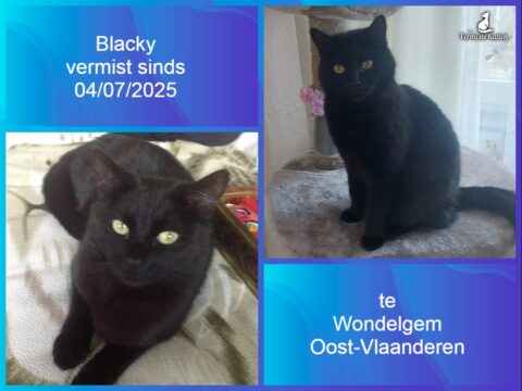Aanvullende kenmerken: Luistert naar de naam Blacky. Volledig zwart met geel/groene ogen. Als je een paar keer zijn naam roept antwoord hij normaal gezien terug. Heel aanhankelijk. Omgeving Wondelgem station is hij verdwenen sinds 4 Juli 2025.