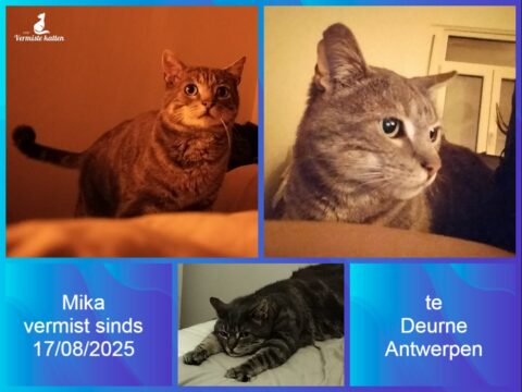 Aanvullende kenmerken: ons katje heeft gezondheidspoblemen waardoor hij enkel aangepast voedsel mag eten het is dus heel belangrijk dat we hem vinden voor het te laat is… Hij luistert naar de naam Mika en het is een grijze kater met donker grijze streepjes. Hij heeft wit aan zijn mondje en een klein beetje wit aan zijn buik. Hij is al wat ouder, tussen de 11-13 jaar. Mika is klein van gestalte maar heeft brede schouders en voorpootjes en stapt een beetje als een bulldog hierdoor.