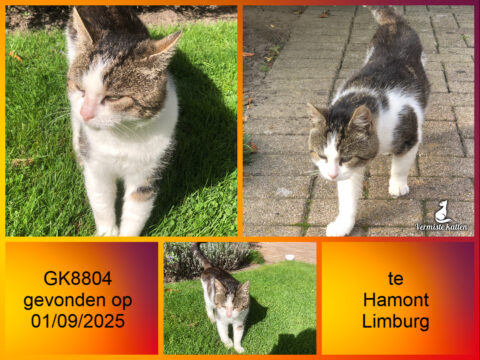 22 sep GK8804 gevonden op 01/09/2025 te Hamont Limburg Geplaatst op 13:31h in Gevonden tijger/cypers met wit, GK Limburg door vermistekatten.be 0 Likes Deel Datum gevonden: 01/09/2025 Straat: Mulk Gemeente: Hamont Provincie: Limburg Geslacht: Kater Aanvullende kenmerken: Tijger met veel wit. In het begin schuw nu al wat tammer. Mail: vermistekatten.be@gmail.com