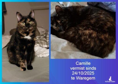 Aanvullende kenmerken: Schildpad (zwart met lichtbruine plekjes) en een grotere witte vlek op de borst. Schuchter als ze buiten is. Niet heel erg gemotiveerd door eten. Komt normaal elke ochtend naar huis, maar is sinds vrijdag 24/10/2025 niet meer thuisgekomen (door de storm?)