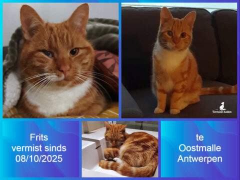 Aanvullende kenmerken: Onze kat, Frits, is sinds woensdag niet meer thuis gekomen op de Herentalsebaan, in de buurt van de Salphensebaan. Frits is een grote, rosse kat met witte vlekken. Hij heeft een slecht oogje waardoor het lijkt dat hij aan één kant blind is. Hij is gechipt.  Wie heeft hem gezien? Zou iedereen in de buurt ook zijn garage/tuinhuis willen controleren aub?