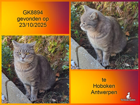 28 okt GK8894 gevonden op 23/10/2025 te Hoboken Antwerpen Geplaatst op 18:00h in Gevonden tijger/cypers, GK Antwerpen door vermistekatten.be 0 Likes Deel Datum gevonden: 23/10/2025 Straat: Verenigde Natieslaan/Den Haaglaan Gemeente: Hoboken Provincie: Antwerpen Geslacht: Kater Aanvullende kenmerken: Niet gechipt. Mooie lichtgrijze tijger. Mail: vermistekatten.be@gmail.com