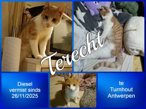 02 dec Diesel is terecht ! Geplaatst op 18:59h in Terug thuis!!!! door vermistekatten.be 0 Likes Deel UPDATE 02/12/2025 : Iemand had Diesel opgemerkt in het industrieterrein in Turnhout en mij gecontacteerd. Hij is gezond en wel weer thuis!