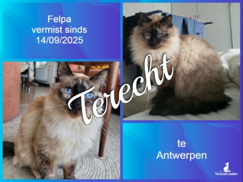 02 dec Felpa is terecht ! Geplaatst op 09:36h in Terug thuis!!!! door vermistekatten.be 0 Likes Deel UPDATE 02/12/2025 : Felpa is sinds deze ochtend terug thuis. Ze werd teruggevonden in een kelder van een appartementsgebouw.