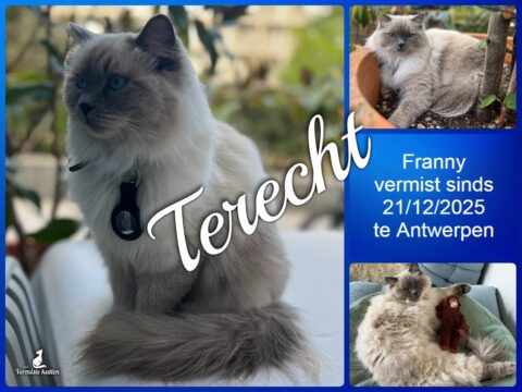 22 dec Franny is terecht ! Geplaatst op 08:59h in Terug thuis!!!! door vermistekatten.be 0 Likes Deel UPDATE 22/12/2025 : Ze was deze ochtend terug! Ze zat wellicht ergens vast, en ze mankt, maar ze is veilig terug thuis.