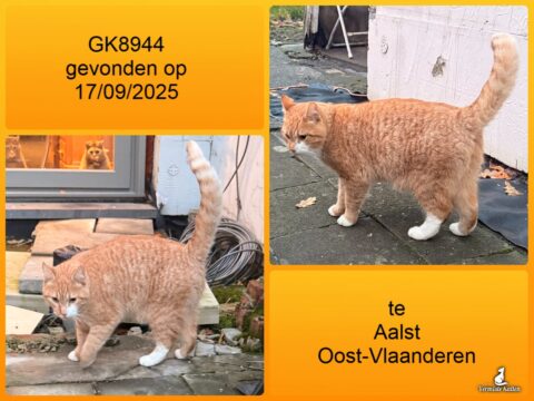 09 dec GK8944 gevonden op 17/09/2025 te Aalst Oost-Vlaanderen Geplaatst op 19:17h in Gevonden ros+wit / wit+ros, GK Oost-Vlaanderen door vermistekatten.be 0 Likes Deel Datum gevonden: 17/09/2025 Straat: Lindenstraat Gemeente: Aalst Provincie: Oost-Vlaanderen Geslacht: Kater Aanvullende kenmerken: Rosse grote kat – nieuwsgierig maar heel voorzichtig Mail: vermistekatten.be@gmail.com