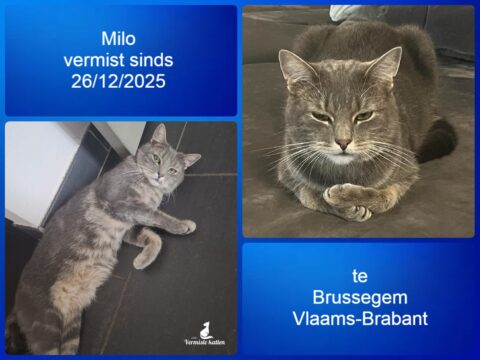 Aanvullende kenmerken: Grijze, getijgerde kat met witte buik en borst, mannetje van 1,5 jaar. Draagt normaal gezien een halsband met de naam Milo en een telefoonnummer. Is een beetje schuw, maar heel lief en vriendelijk.