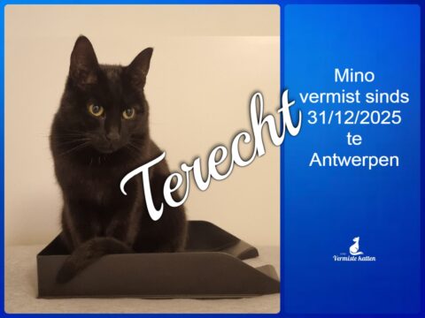 31 dec Mino is terecht ! Geplaatst op 23:00h in Terug thuis!!!! door vermistekatten.be 0 Likes Deel UPDATE 31/12/2025 : Mijn kat Mino is terug gevonden na bijna 10 uur zoeken. Hij was verstopt tussen de bouwerf paar huizen verder. Gelukkig is hij thuis voor de nieuwjaar begint.