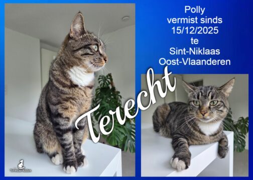 UPDATE 20/12/2025 : Na een hele middag te gaan flyeren stond Polly daarstraks ineens voor de deur. Ze is wat vermagerd, dus we vermoeden dat ze in de buurt opgesloten zat. Voor de rest ziet ze er gezond uit. Bedankt voor de hulp!