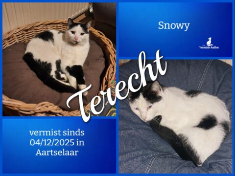 12 dec Snowy is terecht ! Geplaatst op 23:12h in Terug thuis!!!! door redactie 0 Likes Deel UPDATE 12/12/2025 : Wij komen even laten weten dat onze kat snowy terecht is !