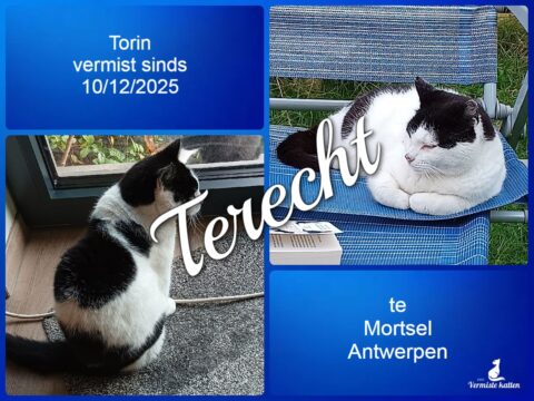10 dec Torin is terecht ! Geplaatst op 18:40h in Terug thuis!!!! door vermistekatten.be 0 Likes Deel UPDATE 10/12/2025 : Stond ineens weer voor de tuindeur te mauwen om binnen te mogen komen