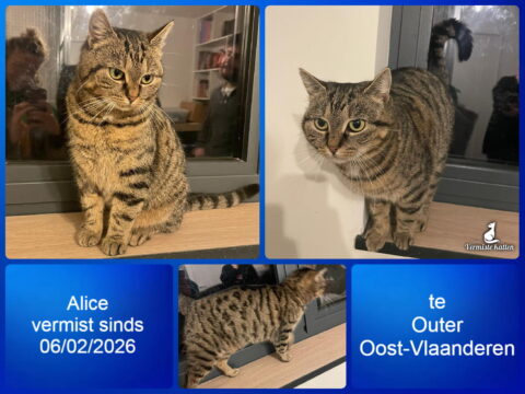Aanvullende kenmerken: Alice is een grijs gestreepte/gevlekte kat met groene ogen. Ze is niet groot, in het begin angstig maar eens je haar 1 keer kan aaien blijft ze flossen.