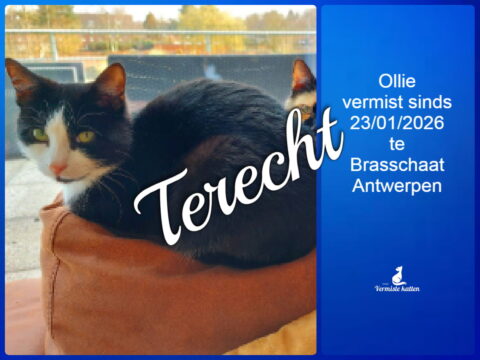 01 feb Ollie is terecht ! Geplaatst op 23:55h in Terug thuis!!!! door vermistekatten.be 0 Likes Deel UPDATE 01/02/2026 : Goed nieuws ! Ollie is terug thuis gekomen na 7 dagen ! Bedankt voor de hulp.
