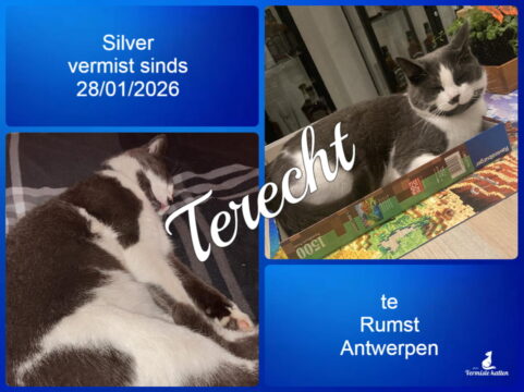 UPDATE 12/02/2026: Silver is gisterenavond thuis gekomen, 5 minuten na een zoekactie naar hem doorheen Rumst centrum. Hij is wellicht op onze stemmen/ gefluit afgekomen en ons gevolgd naar huis.