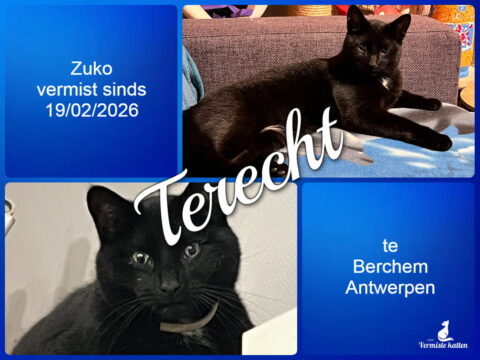 26 feb Zuko is terecht ! Geplaatst op 15:17h in Terug thuis!!!! door vermistekatten.be 0 Likes Deel UPDATE 26/02/2026 : ik wil even melden dat Zuko weer thuis is.