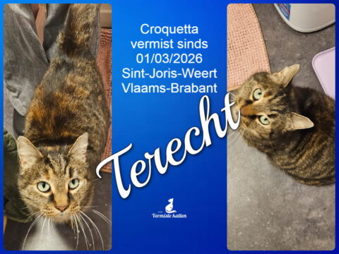 01 mrt Croquetta is terecht ! Geplaatst op 21:18h in Terug thuis!!!! door vermistekatten.be 0 Likes Deel UPDATE 01/03/026 : We hebben na de hele dag zoeken ze gevonden met behulp van de katten van onze buren. Bij avondschemering kwamen ze af op mijn stemgeluid en kwam ietsje later ook onze eigen kat aangelopen.