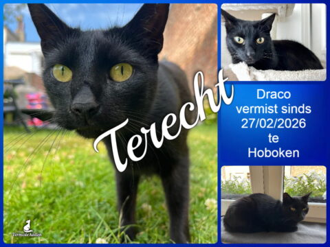 06 mrt Draco is terecht ! Geplaatst op 19:40h in Terug thuis!!!! door vermistekatten.be 0 Likes Deel UPDATE 06/03/2026 : Draco is na een week afwezigheid weer thuis. Hij heeft enorme honger en dorst, maar hij is er.