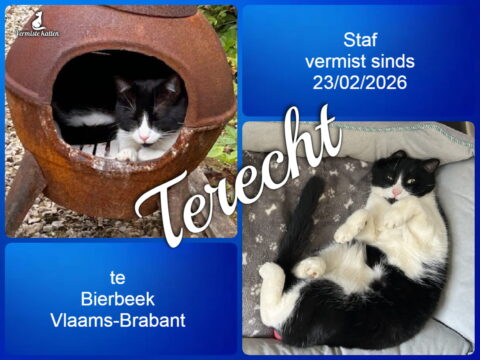 26 mrt Staf is terecht ! Geplaatst op 10:03h in Terug thuis!!!! door vermistekatten.be 0 Likes Deel UPDATE 26/03/2026 : Staf zat deze voormiddag plots terug op de vensterbank. Hij is zeker gevoederd geweest want na 4 weken zag hij eruit als anders. Gelukkig terug thuis bij zijn broertje Fonz.