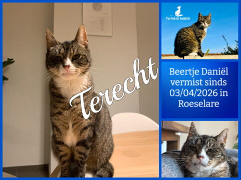22 apr Beertje Daniël is terecht! Geplaatst op 09:00h in Terug thuis!!!! door redactie 0 Likes Deel UPDATE 22/04/2026: Deze ochtend is onze poes met een gebroken achterpoot terug binnen gekomen. Zoekertje mag dus verwijderd worden! Super bedankt om te delen!
