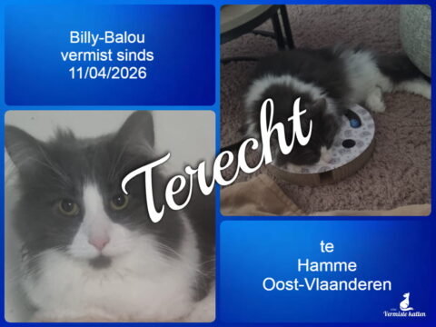 UPDATE 12/04/2026 : Billy-Balou is dankzij sociale media terecht ! Had zich verstopt enkele huizen verder in een boekenruilkastje en iemand had ze gevonden en binnengenomen zodat hij niet overreden werd.