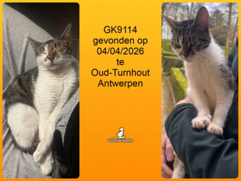 04 apr GK9114 gevonden op 04/04/2026 te Oud-Turnhout Antwerpen Geplaatst op 18:15h in Gevonden tijger/cypers met wit, GK Antwerpen door vermistekatten.be 0 Likes Deel Datum gevonden: 04/04/2026 Straat: Corsendonk Gemeente: Oud-Turnhout Provincie: Antwerpen Geslacht: Geen idee Aanvullende kenmerken: We hebben geen dierenarts gecontacteerd. Mail: vermistekatten.be@gmail.com