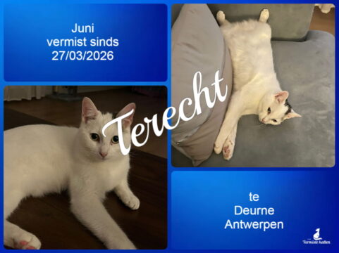 10 apr Juni is terecht! Geplaatst op 10:11h in Terug thuis!!!! door vermistekatten.be 0 Likes Deel UPDATE 10/04/2026: Hij kwam zelf naar huis. Om 5 uur s morgens zat hij voor de deur. Bedankt voor iedereen.
