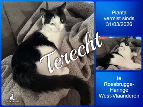 12 apr Planta is terecht ! Geplaatst op 10:42h in Terug thuis!!!! door vermistekatten.be 0 Likes Deel UPDATE 12/04/2026 : Planta is terug, we hebben een vangkooi geplaatst in de buurt waar we vroeger woonden, na enkele zichtmeldingen. Gisterenavond zat ze erin, gezond en wel. Nu even bekomen thuis.