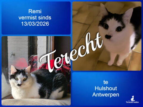 16 apr Remi is terecht ! Geplaatst op 19:05h in Terug thuis!!!! door vermistekatten.be 0 Likes Deel UPDATE 16/04/2026 : Ze komt terug eten en slapen in het tuinhuis. Zr is nu van binnenkat naar buitenkat gegaan 😄