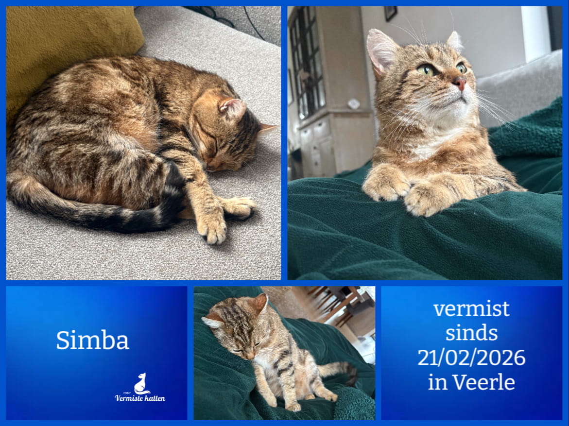 Naam kat: Simba Datum vermist: 21/02/2026 Plaats verdwijning: Lange Blok Woonplaats: Veerle Provincie: Antwerpen Geslacht: Kater Gesteriliseerd/Gecastreerd: Ja Geboortedatum Kat: 15/10/2016 Chip: Ja Aanvullende kenmerken: Hij heeft een cirkel op de rechterkant van zijn...