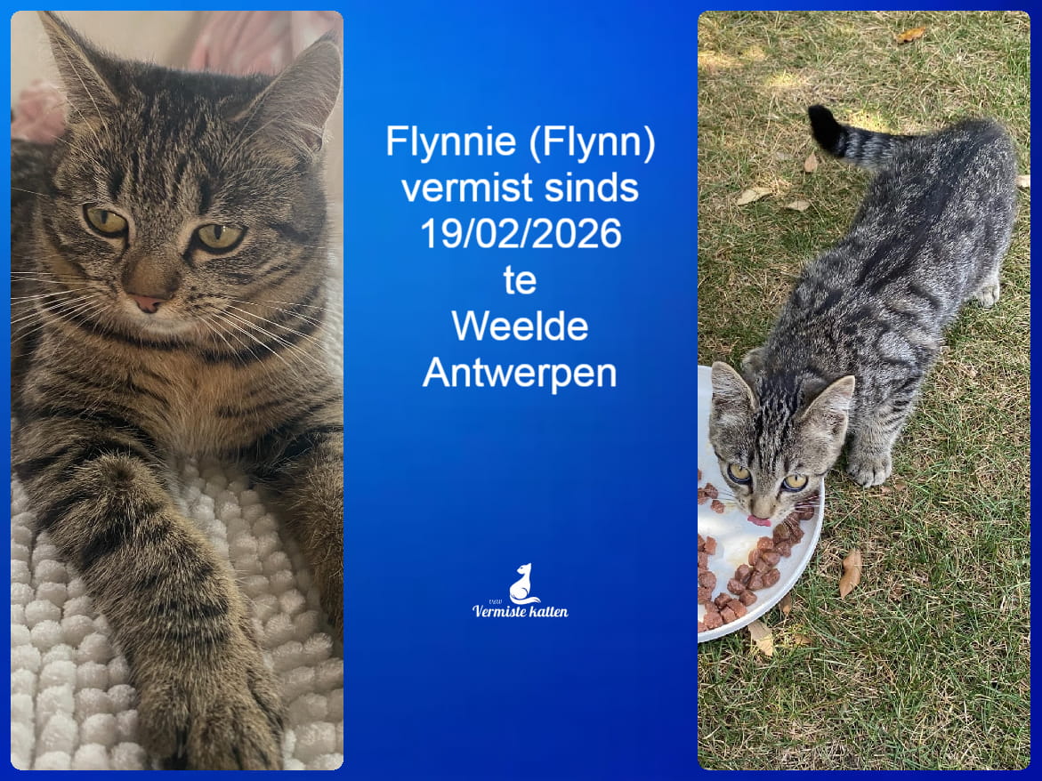 Naam kat: Flynnie (Flynn) Datum vermist: 19/02/2026 Plaats verdwijning: Oudlijns Woonplaats: Weelde Provincie: Antwerpen Geslacht: Kattin Gesteriliseerd/Gecastreerd: Nee Geboortedatum Kat: April 2025 Chip: Nee Aanvullende kenmerken: Grijze kater / gele ogen Mail: vermistekatten.be@gmail.com...