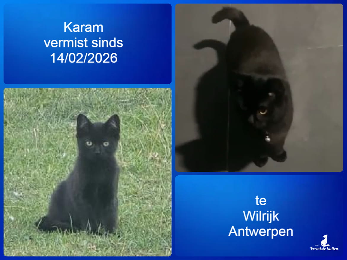 Naam kat: Karam Datum vermist: 14/02/2026 Plaats verdwijning: Michel Willemslaan Woonplaats: Wilijk Provincie: Antwerpen Geslacht: Kater Gesteriliseerd/Gecastreerd: Nee Geboortedatum Kat: 8 maanden Chip: Nee Aanvullende kenmerken: Helemaal zwart, heeft een ringbel om zijn nek. Mail: vermistekatten.be@gmail.com...