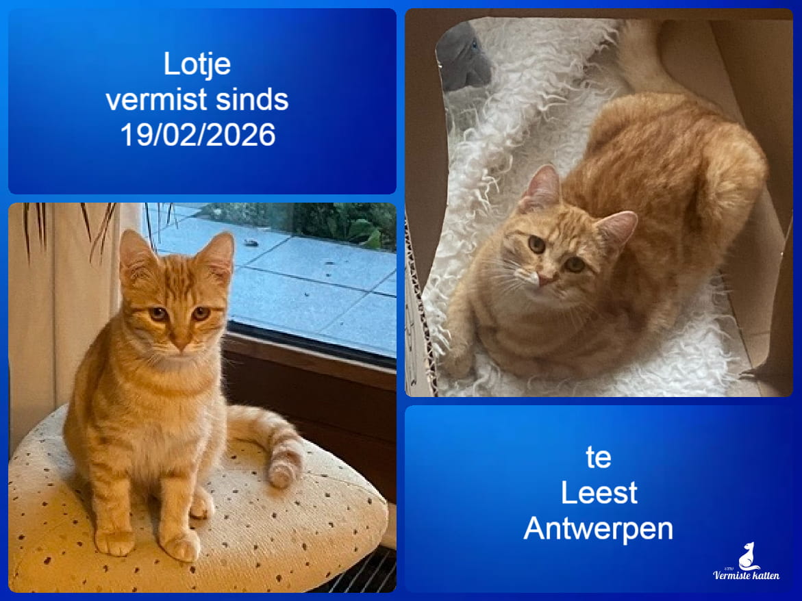 Naam kat: Lotje Datum vermist: 19/2/2026 Plaats verdwijning: Kapelseweg Woonplaats: 2811 Leest Provincie: Antwerpen Geslacht: Kattin Gesteriliseerd/Gecastreerd: Ja Geboortedatum Kat: 28/03/2025 Chip: Ja Aanvullende kenmerken: Lotje is een rosse kattin. Klein, lief, heel tam en...