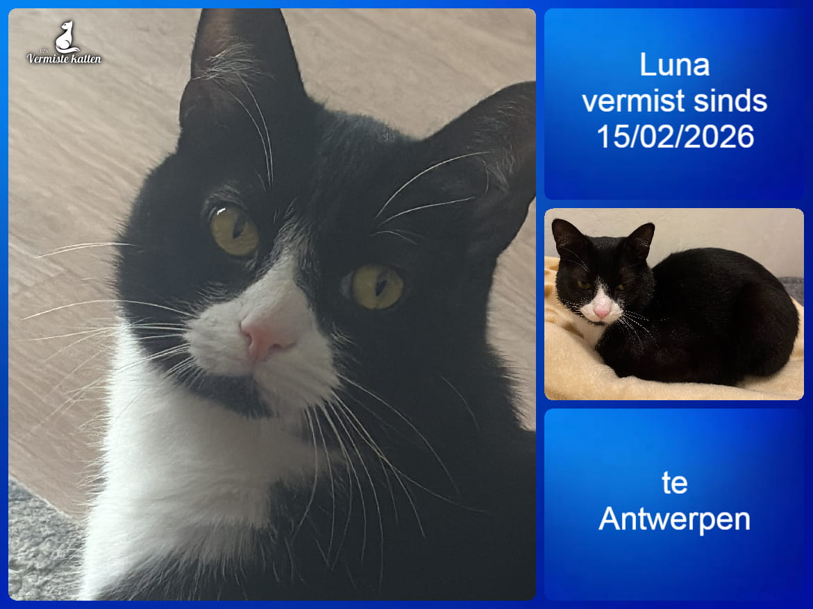 Naam kat: Luna Datum vermist: 15/02/2026 Plaats verdwijning: Julius Vuylstekelaan Woonplaats: Antwerpen Provincie: Antwerpen Geslacht: Kattin Gesteriliseerd/Gecastreerd: Ja Geboortedatum Kat: 01/04/2024 Chip: Ja Aanvullende kenmerken: Luna is een heel vriendelijke kattin, als iemand haar...