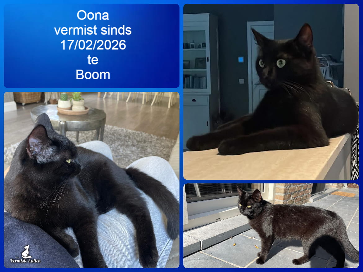 Naam kat: Oona Datum vermist: 17/02/2026 Plaats verdwijning: Langeweide Woonplaats: Boom Provincie: Antwerpen Geslacht: Kattin Gesteriliseerd/Gecastreerd: Ja Geboortedatum Kat: 09/03/2025 Chip: Ja Aanvullende kenmerken: Kleine, zwarte kattin zonder halsbandje Mail: vermistekatten.be@gmail.com...