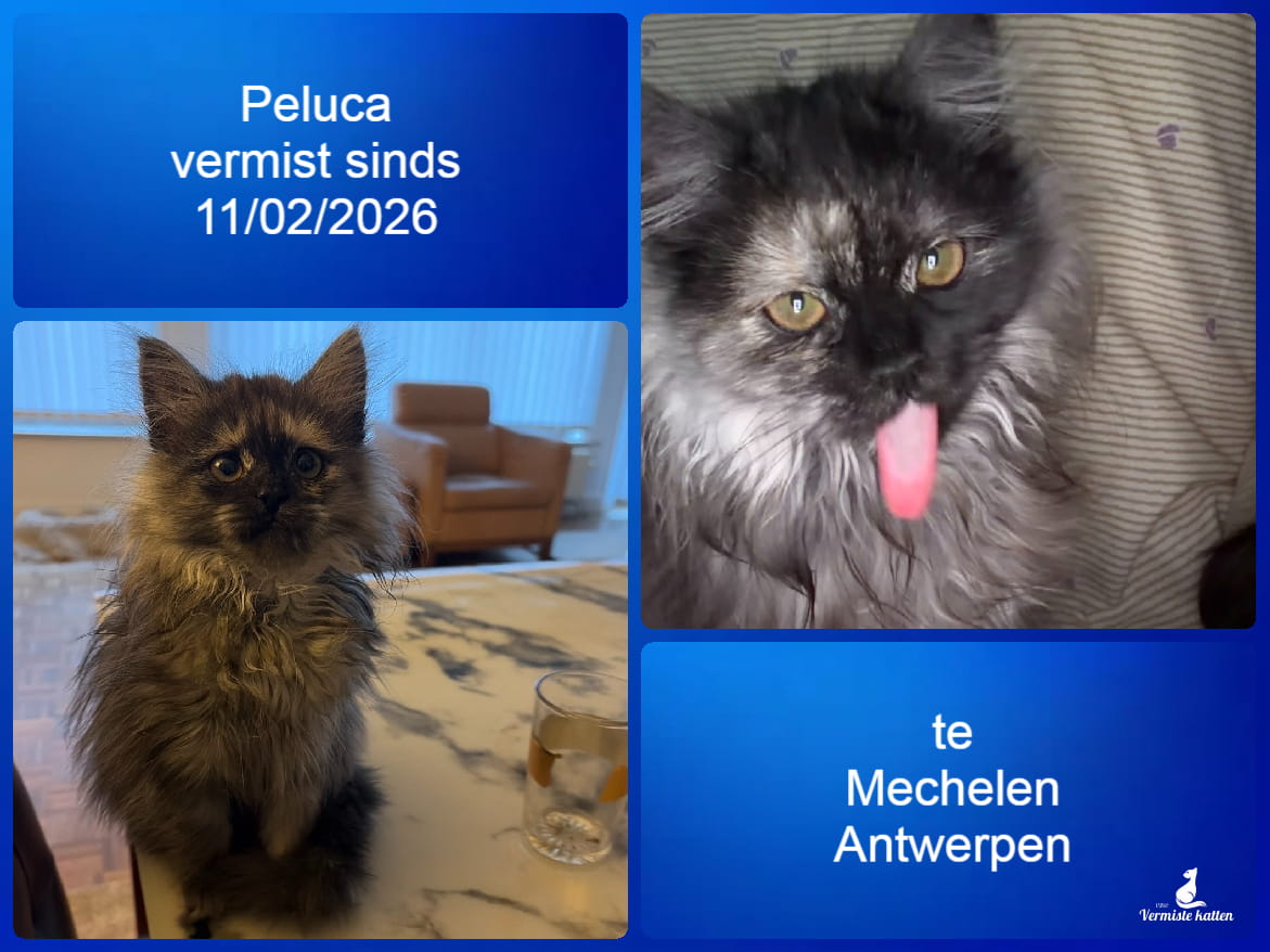 Naam kat: Peluca Datum vermist: 11/02/2026 Plaats verdwijning: Lange hofstraat Woonplaats: Mechelen Provincie: Antwerpen Geslacht: Kattin Gesteriliseerd/Gecastreerd: Nee Geboortedatum Kat: 5 maanden Chip: Nee Aanvullende kenmerken: Klein, groene ogen, grijs met zwart, Mail: vermistekatten.be@gmail.com...