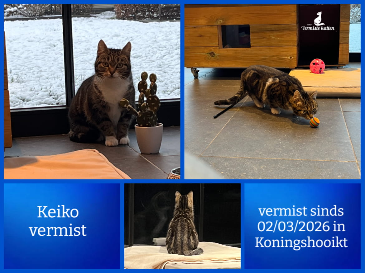 Naam kat: Keiko Datum vermist: 2/3/26 Plaats verdwijning: Liersebaan Woonplaats: 2500 Koningshooikt Provincie: Antwerpen Geslacht: Kattin Gesteriliseerd/Gecastreerd: Ja Geboortedatum Kat: 1/4/2025 Chip: Ja Aanvullende kenmerken: Witte pootjes - tijgerkat (felis vulgaris) Mail: vermistekatten.be@gmail.com...