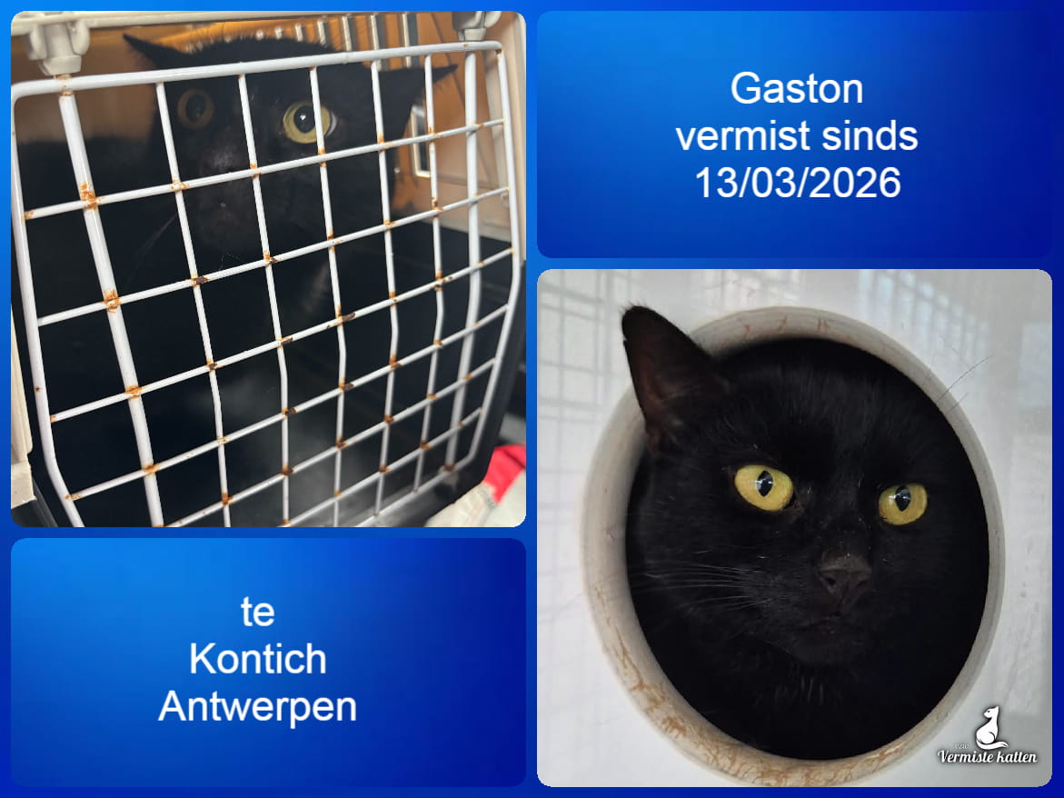 Naam kat: Gaston Datum vermist: 13/03/2026 Plaats verdwijning: Biesaard Woonplaats: 2550 kontich Provincie: Antwerpen Geslacht: Kater Gesteriliseerd/Gecastreerd: Ja Geboortedatum Kat: 01/02/2018 Chip: Ja Aanvullende kenmerken: Is volledig zwarte kat is bang Kwan net van...